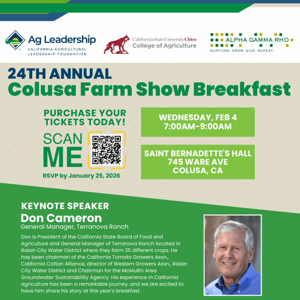 2026 Colusa Farm Show Breakfast Wednesday, February 4, 2026 7:00am - 9:00am Add to calendar Google Calendar iCalendar Outlook 365 Outlook Live Export .ics file Saint Bernadette’s Hall 745 Ware Avenue Colusa, CA Purchase Tickets Download Program Info Join us for the 2026 Colusa Farm Show Breakfast! Wednesday, February 4, 2026 Saint Bernadette’s Hall, 745 Ware Avenue, Colusa CA Keynote Speaker Don Cameron President of the California State Board of Food and Agriculture Don is General Manager of Terranova Ranch which is in Raisin City Water District and farms 25 different crops. Raisin City Water District has no surface water rights. They only pump groundwater. Don has been a pioneer in groundwater recharge projects on his farm in Fresno County. He has been chairman of the California Tomato Growers Assn., California Cotton Alliance, director of Western Growers Assn., Raisin City Water District and Chairman for the McMullin Area Groundwater Sustainability Agency. Sponsorship Opportunities $2,500 Platinum Sponsor (includes twelve breakfast tickets, recognition in the program, and the option to hang a wall banner in the meeting room) $1,500 Gold Sponsor (includes eight breakfast tickets, recognition in the program, and the option to hang a wall banner in the meeting room) $1,000 Silver Sponsor (includes six breakfast tickets and recognition in the program) $500 Bronze Sponsor (includes four breakfast tickets and recognition in the program) Single Breakfast Ticket : $75 RSVP by January 25, 2026 Payment: Please make checks payable to California Agricultural Leadership Foundation Mail checks to: California Agricultural Leadership Foundation 80 Garden Court, Suite 270,Monterey, CA 93940 Credit Card (please visit CALF website or call 530-574-1554) For further information, please call 530-574-1554 or email Anna Nicholson anicholson@agleaders.org